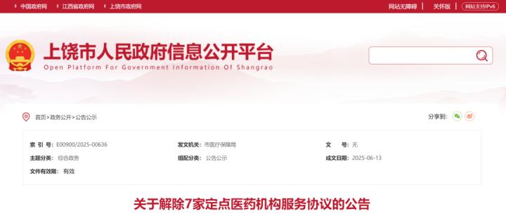 按照《江西省医疗机构医疗保障定点管理暂行办法》《江西省零售药店医疗保障定点管理暂行办法》(赣医保字〔2023〕25号)等相关规定及医保服务协议约定内容,经研究,决定解除7家定点医药机构医保服务协议,现将有关名单予以公布。