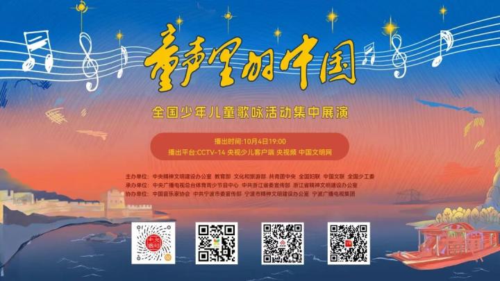 由中央精神文明建设办公室、教育部、共青团中央、全国妇联、中国文联、中国少工委联合主办的2025年“童声里的中国”全国少年儿童歌咏活动集中展演,将于10月4日(星期六)19:00在中央广播电视总台央视少儿频道(CCTV-14)正式播出。