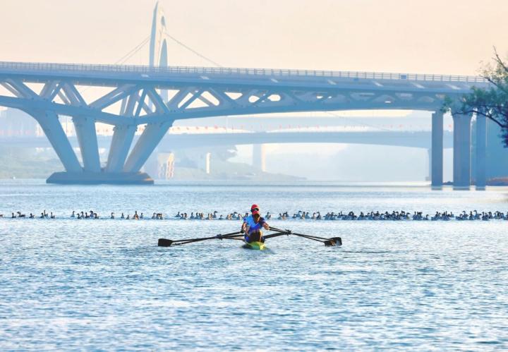 清晨五点半,一支赛艇正剪开平静的江面,疾驰而来。“根据每个会员的时间安排,训练从早到晚都有,早上五点半到晚上六七点。一节课训练时间在90分钟左右。”水上运动中心的凯希教练说。朝阳挣脱了地平线的束缚,将金色的光芒泼洒在江面上,也为训练员们汗湿的脊背镀上了一层耀眼的光边。那艘赛艇,便在粼粼金光中,变成了一支射向光明的箭。