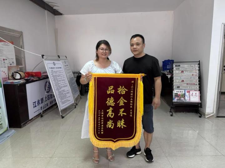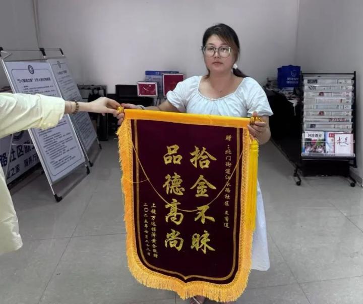 为表达由衷的感激,失主特意来到江永路社区,将一面印有“拾金不昧 品德高尚”字样的鲜红锦旗郑重地交到王香连手中。“真是太感谢你了!要不是你拾金不昧又及时报警,我这损失就大了!”失主紧握着王香连的手,话语中充满感动。