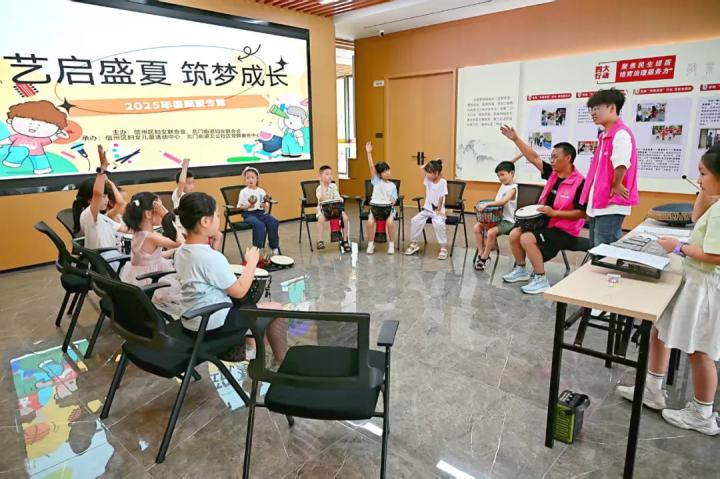 暑假期间,如何安顿孩子成了许多家长的一个难题。家住北门街道文公社区的众多家长们却没有这个烦恼。社区举办的"艺启盛夏 筑梦成长"暑期夏令营活动,为社区孩子们打造了融合绘画手工、趣味阅读、团队游戏的艺术成长空间。彩笔沙沙作响,乐器叮咚敲击,社区党群服务中心化身为童趣乐园,孩子们在艺术熏陶中收获友谊、自信与成长。
