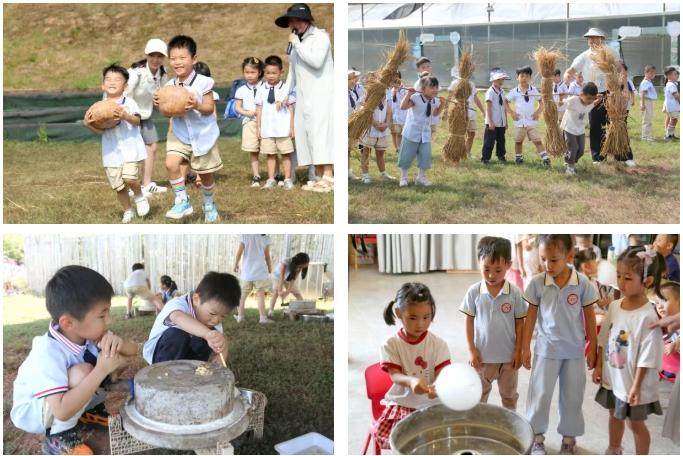 大草坪上,农耕运动会热烈开展。小朋友们分组参与多项趣味竞赛,在游戏中学习团队协作。美食制作区同样热闹非凡:石磨前,孩子们认真推动磨盘,仔细观察黄豆如何一步步变成白白的豆浆;棉花糖机旁,他们目不转睛地看着糖丝飞舞,最终收获一朵朵甜美的棉花糖。