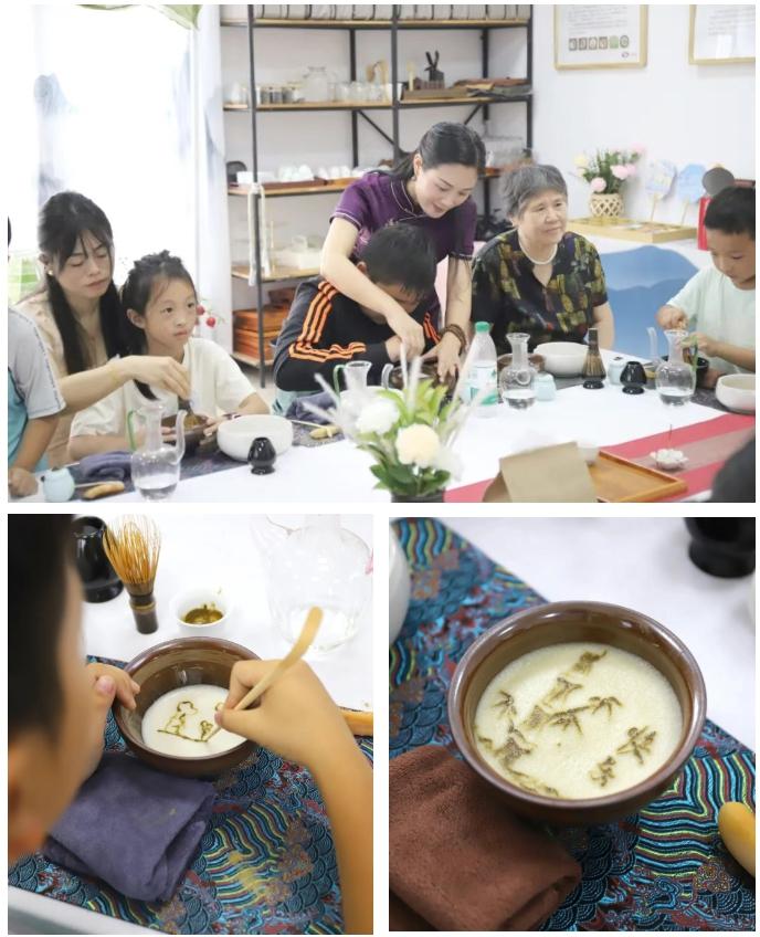 实践环节,孩子们在家长的协助下亲手尝试点茶技艺,小心控制手腕力度,专注击拂茶汤。“老师,我的茶沫为什么不够细腻?”面对孩子的疑问,老师穿梭于各组之间耐心指导,手把手帮助孩子们掌握技巧。随着一盏盏茶汤逐渐泛起洁白绵密的泡沫,现场气氛也被推向高潮。孩子们纷纷展示自己的点茶成果,互相欣赏交流。一名叫小童的小朋友兴奋地举起茶盏:“看我点的茶,像不像一棵松树?”