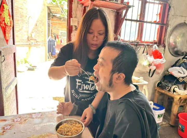 “我弟弟虽然不会说话,但我相信他认得我。”刘晓琴轻声说着,双手熟练地为弟弟整理衣领。刘文福今年43岁,8个月大时被诊断为多重残疾一级,智力、肢体与语言均存在严重障碍。