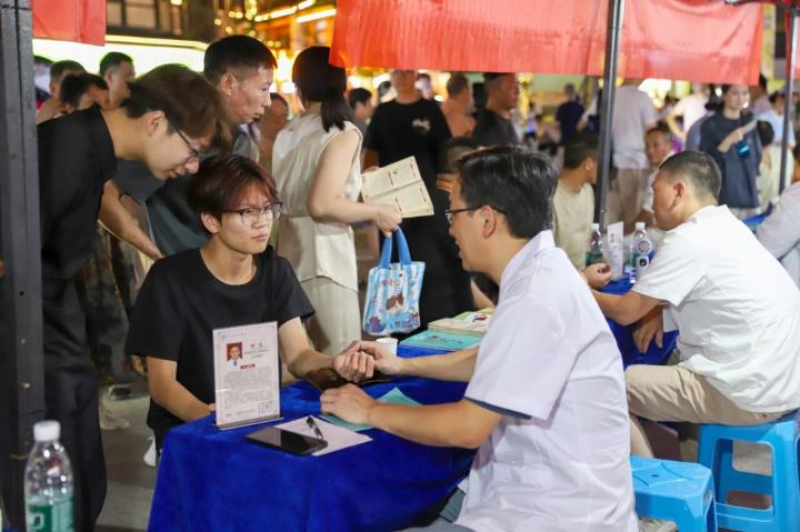 在中医名医问诊区,几个展位前早早排起了小长队,坐诊的几位中医耐心地为居民搭脉问诊,仔细询问饮食、作息情况,结合体质给出个性化调理方案。家住附近的陈阿姨笑着说:“不用跑医院,在家门口就能让名医看诊,太方便了!”